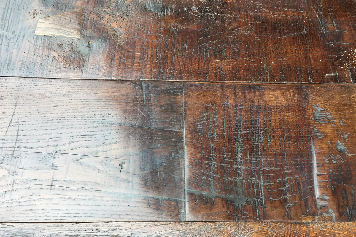 This is our signature skill and surprisingly cost effective. Each board is individually hand-DA sanded to a chosen texture in our workshop. Our purpose is to clean each surface but retain the wear, the texture and the character of these old boards that has been created by the traffic and usage they have been subject to over many years. Each board is placed on a joiners bench and as much or as little as we want of the age and wear can be lightly sanded away. We clean and refresh timber, so it grows more appealing and pleasing , without losing the history. This is all done against a signed and dated 1m2 sample panel agreed by the client.